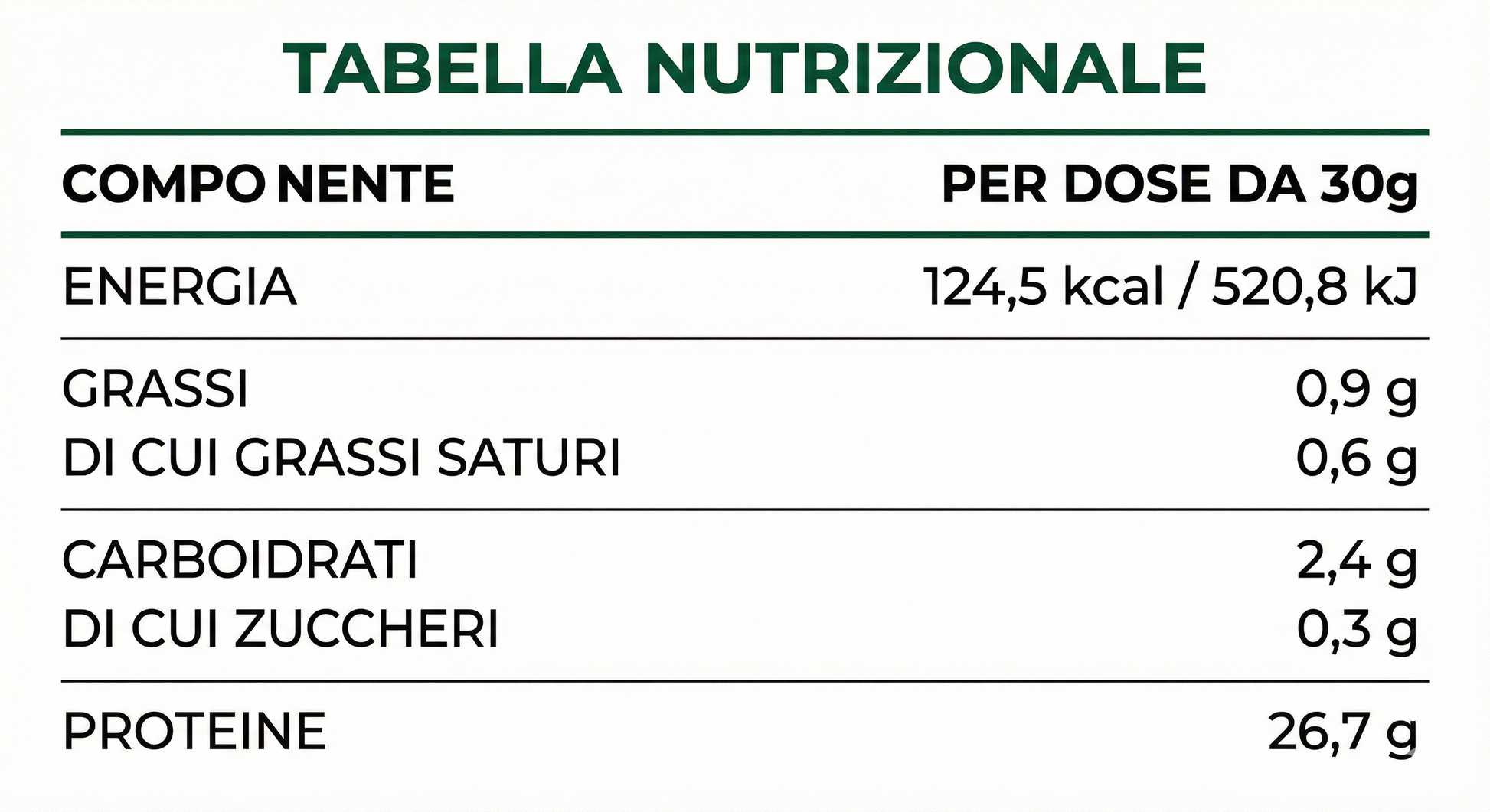 Il profilo aminoacido riflette l'alta qualità biologica della materia prima nativa, non alterata da processi termici aggressivi.